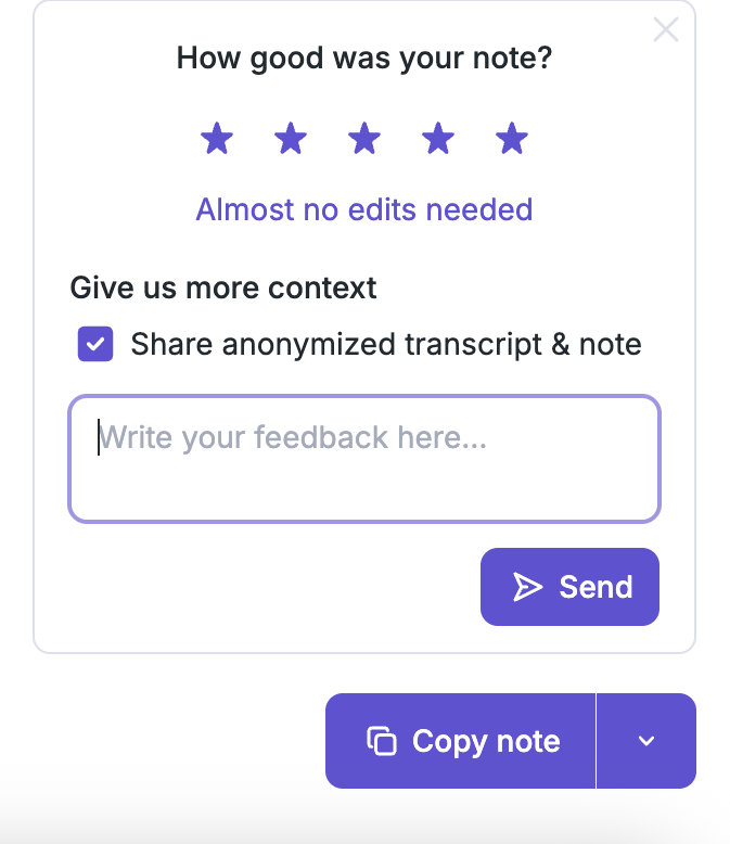 Clicking the “Share anonymized transcript & note” box before sending your feedback helps Support to investigate more thoroughly to see how information was captured in your transcript and generated into your note.