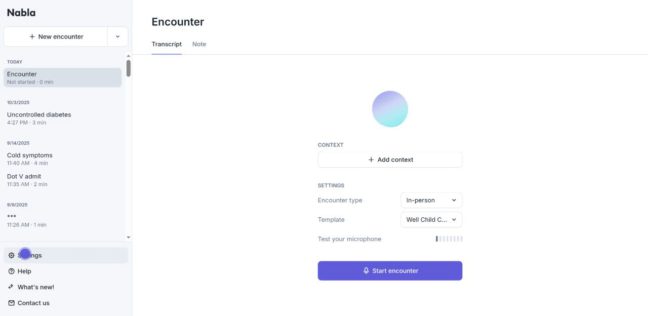 The ‘Note template’ drop-down is where you will find the selection of Nabla templates to choose from.
