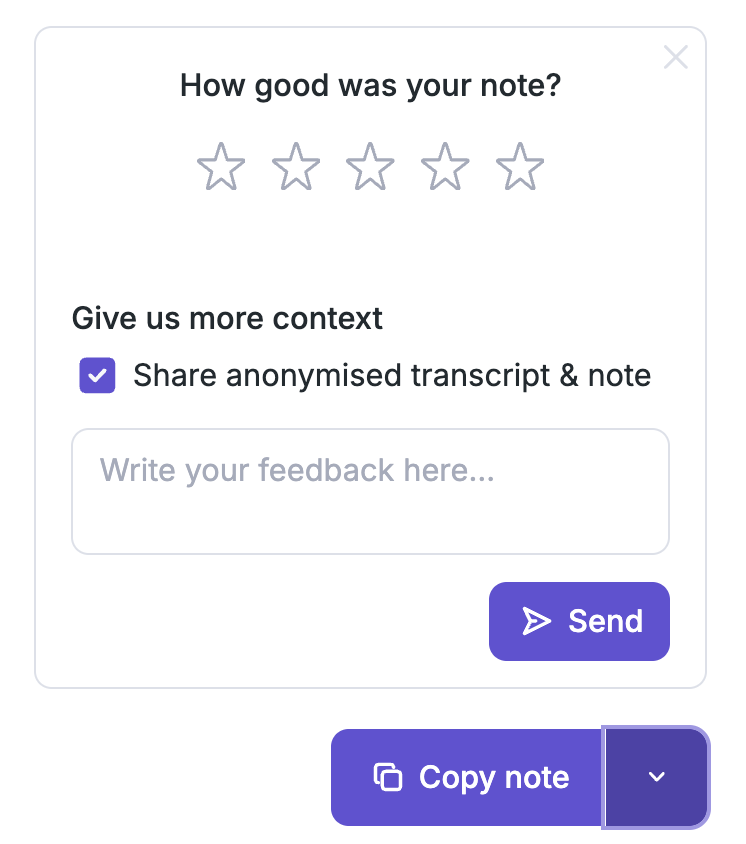 Once clicking on ‘Copy note’ after generating your note, you will receive a pop-up asking for a star rating and feedback.