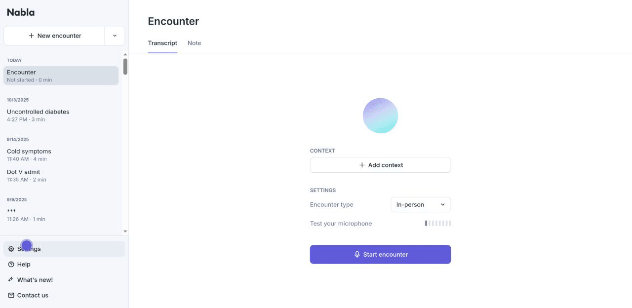 Before starting your encounter add your personal Dot phrases by navigating to your Nabla Settings, clicking on the Dot phrases tab, and then clicking ‘+New dot phrase’